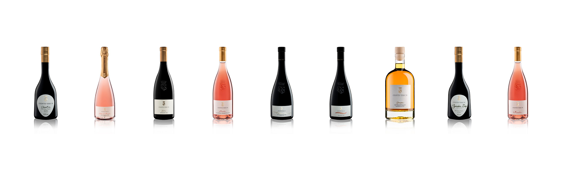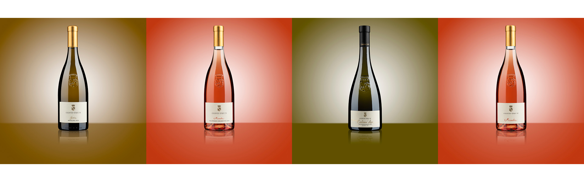 Still Life di bottiglie di: vino, olio e grappa della cantina Conti Thun di proprietà della famiglia Thun.